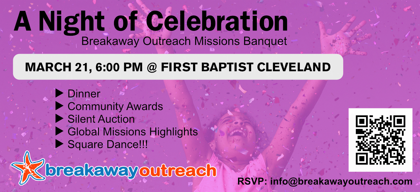 March 21, 2024, was Breakaway’s “Night of Celebration” missions banquet in Cleveland, Tennessee. Oh, what a night it was! Thanks to the entire Breakaway community for making this evening such a festive and heartfelt time of storytelling, vision casting, and most importantly, celebrating God’s life-changing work through this ministry. The following are the recipients of community awards during the banquet.